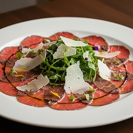 מרכיבים: סינטה פרוסה דק, שמן זית איכותי, מלח אטלנטי, פלפל שחור גרוס, רוקט, שבבי פרמזן, נגיעת בלסמי מצומצם